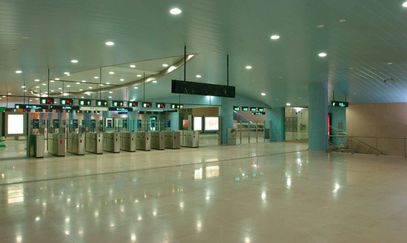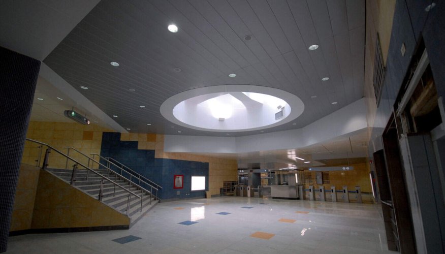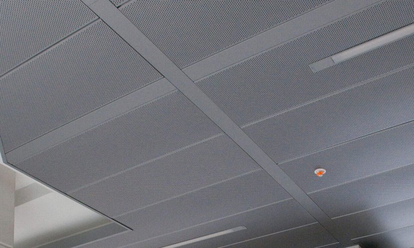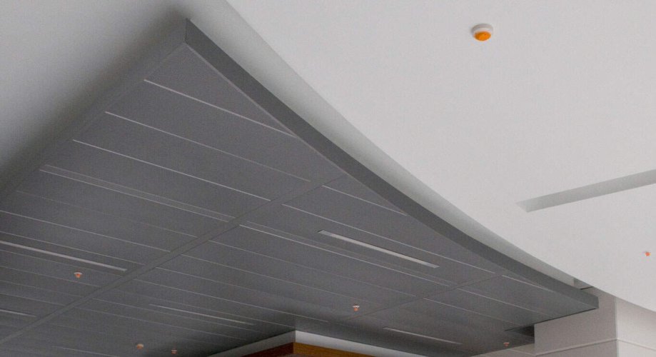 Cielo metálico lineal ancho, de cantería cerrada, aporta carácter al diseño interior.
