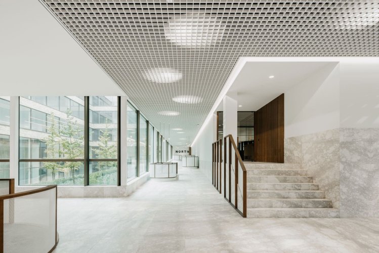 Cielo metálico abierto y transparente formado por perfiles en forma de U.