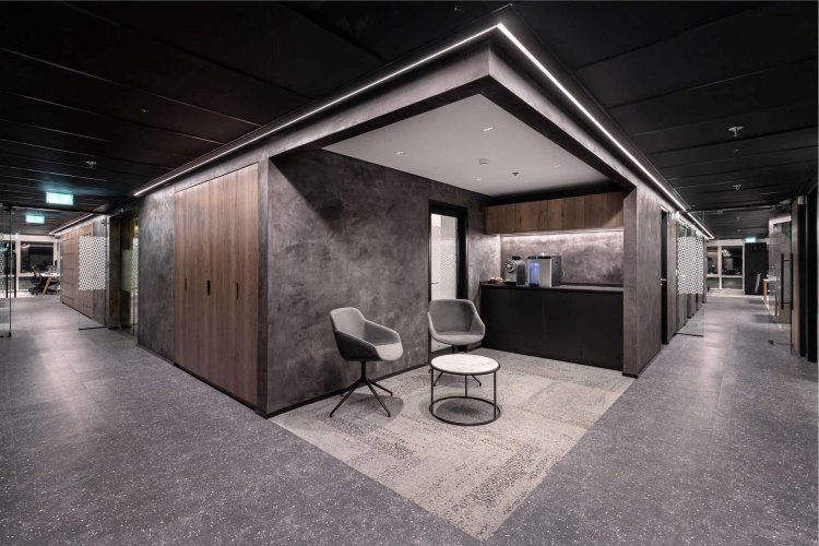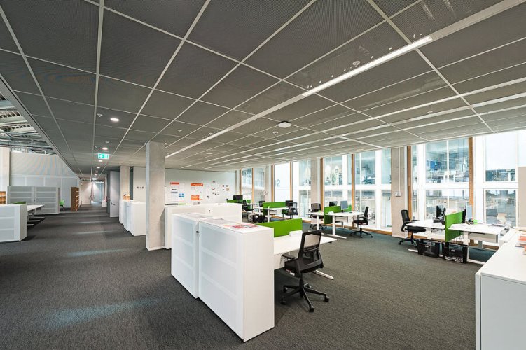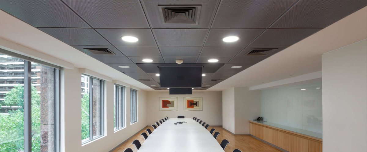 Las bandejas de malla estriada en perfiles T mejoran el patrón del diseño modular.