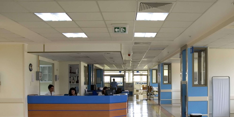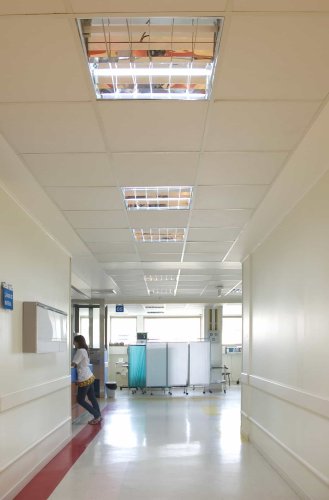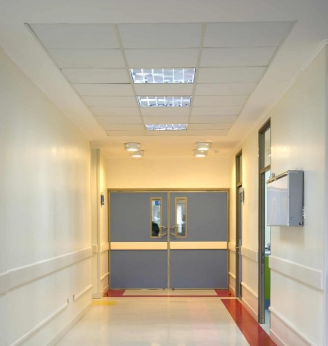 Placa de fibra mineral de textura lisa, limpia y duradera.