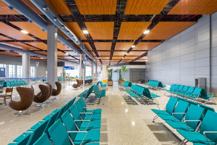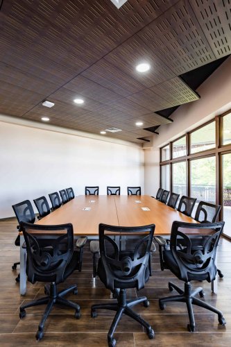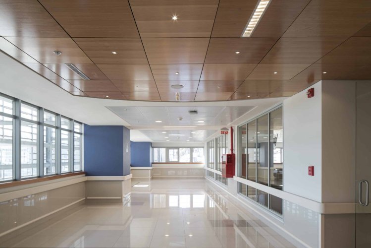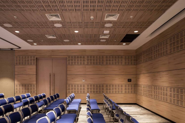 Cielo de madera compuesto por bandejas de madera aglomerada HR.