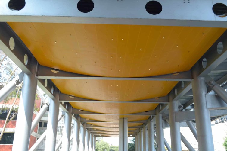 Cielo metálico de terminación lisa con pequeñas canterías entre los paneles.