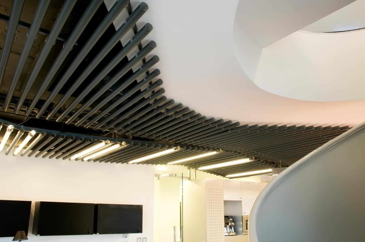 El cielo Tubrise Horizontal de Hunter Douglas es una solución arquitectónica de cielo modular abierto compuesto por paneles tubulares lineales, diseñado para generar continuidad entre los espacios, acentuar la sensación de profundidad y mejorar el desempeño acústico de los recintos.