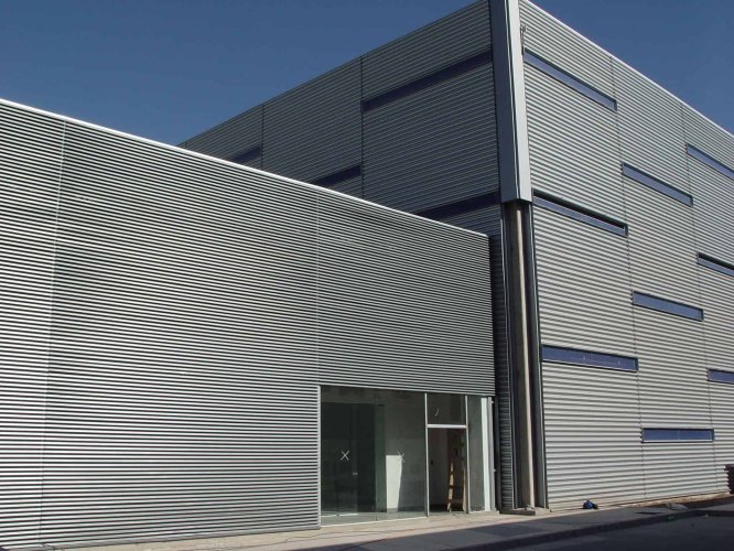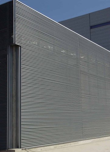 Las celosías C están formadas por paneles de aluzinc termoesmaltados en línea continua con separación variable, otorgando una textura visual uniforme.